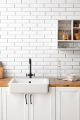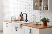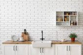 Zdjęcie "Zlewozmywak z pięknymi kwiatami i naczyniami kuchennymi na blacie w pobliżu ściany z białej cegły" może być wykorzystywane do celów osobistych i komercyjnych zgodnie z warunkami zakupionej licencji Royalty-free. Obraz jest dostępny do pobrania w jakości wysokiej rozdzielczości do 5760x3840.