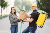 Smart food delivery service man in white uniform giving fresh food to odbiorca