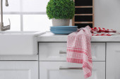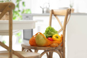 Wysokie krzesełko z jedzeniem w dziecięcej zastawie stołowej na tacy w pomieszczeniu, zbliżenie
