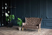 Przestronny, klasyczny pokój w stylu szafy ma sofę. Nowoczesny minimalistyczny salon w stylu loft z kanapą Brown w ciemnym pokoju. Sofa i duże zielone rośliny domu w doniczce na drewnianej podłodze.