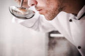 Biały kucharz kuchni noszący kapelusz z bliska. Temat przemysłu gastronomicznego.