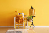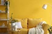 Wnętrze salonu z wygodną sofą, półką i kwiatowym wystrojem