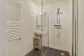 Nowoczesne wnętrze prysznica ze szklaną ścianą i lustrem