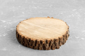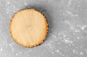 Widok z góry drewnianej tacy na tle cementu. Puste miejsce na projekt.