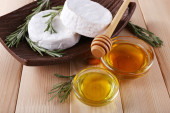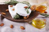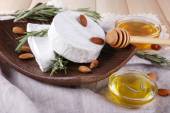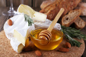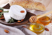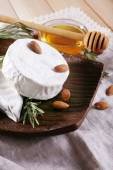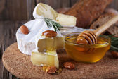 Ser Camembert, orzechy, miód i chleb na deska do krojenia na drewniane tła