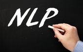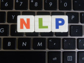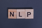 zbliżenie obrazu dłoni młodego biznesmena trzymającego drewnianą kostkę z literą N. NLP na drewnianej kostce na niebieskim tle z przestrzenią do kopiowania