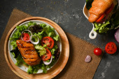 Top view, Kobieta jedząca zdrową dietę, Grillowana pierś z kurczaka ze świeżą sałatką i szklanką soku pomarańczowego.