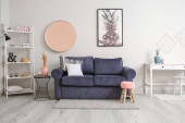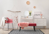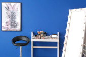 Wnętrze sali oświetleniowej z toaletką, ławką i regałami