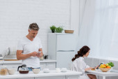 wesoły pansexual osoba gospodarstwa rogaliki w pobliżu partnera z podróży życia gazety