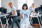 Zdjęcie "Czyści podłogę. Grupa pracowników czyste nowoczesne biuro razem w ciągu dnia." może być wykorzystywane do celów osobistych i komercyjnych zgodnie z warunkami zakupionej licencji Royalty-free. Obraz jest dostępny do pobrania w jakości wysokiej rozdzielczości do 5760x3840.