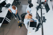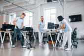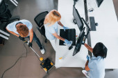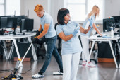 Czyści podłogę. Grupa pracowników czyste nowoczesne biuro razem w ciągu dnia.