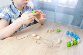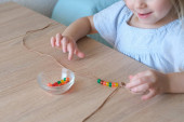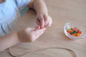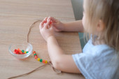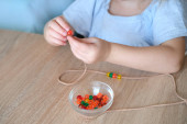 małe dziecko, maluch wiszące kolorowe plastikowe koraliki na sznurku, dziecięce palce zbliżenie, koncepcja rozwoju umiejętności motorycznych, wrażenia dotykowe, kreatywność, rozrywka dla dzieci