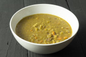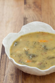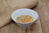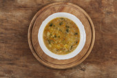 Zupa ryżowa w białym okrągłym talerzu zbliżenie na szarym żelaznym stole