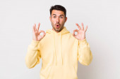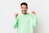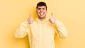 young handsome hicpanic man smiling joyfully and looking happy, feeling carefree and positive with both thumbs up