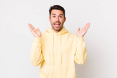 Zdjęcie "young handsome hicpanic man smiling joyfully and looking happy, feeling carefree and positive with both thumbs up" może być wykorzystywane do celów osobistych i komercyjnych zgodnie z warunkami zakupionej licencji Royalty-free. Obraz jest dostępny do pobrania w jakości wysokiej rozdzielczości do 5760x3840.