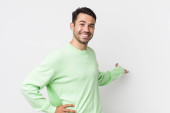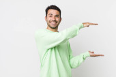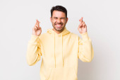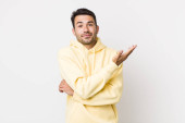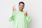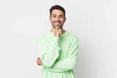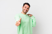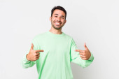 young handsome hicpanic man looking happy, arrogant, proud and self satisfied, feeling like a number one