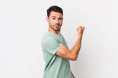 young handsome hicpanic man feeling happy, surprised and proud, pointing to self with an excited, amazed look