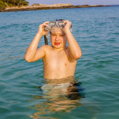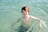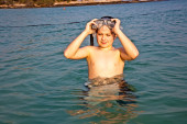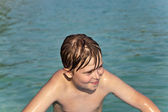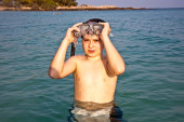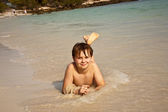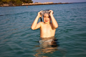młody chłopak stoi w piękne czyste morze, ciesząc się w