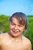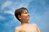 uśmiech szczęśliwy młody chłopak z brązowe włosy i oczy na plaży