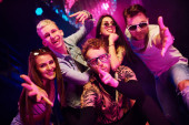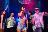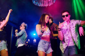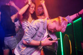 Dziewczyna trzymająca butelkę. Młodzi ludzie bawią się w nocnym klubie z kolorowymi światłami laserowymi.
