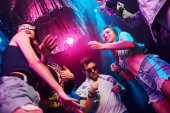 Zdjęcie "Dziewczyna trzymająca butelkę. Młodzi ludzie bawią się w nocnym klubie z kolorowymi światłami laserowymi." może być wykorzystywane do celów osobistych i komercyjnych zgodnie z warunkami zakupionej licencji Royalty-free. Obraz jest dostępny do pobrania w jakości wysokiej rozdzielczości do 5760x3840.