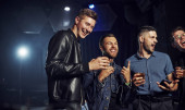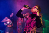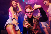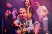 Młodzi ludzie bawią się w nocnym klubie z kolorowymi światłami laserowymi.