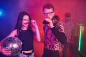 Zdjęcie "Aktywna para tańczy i pozuje. Młodzi ludzie bawią się w nocnym klubie z kolorowymi światłami laserowymi." może być wykorzystywane do celów osobistych i komercyjnych zgodnie z warunkami zakupionej licencji Royalty-free. Obraz jest dostępny do pobrania w jakości wysokiej rozdzielczości do 5760x3840.