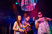 Zdjęcie "Aktywna para tańczy i pozuje. Młodzi ludzie bawią się w nocnym klubie z kolorowymi światłami laserowymi." może być wykorzystywane do celów osobistych i komercyjnych zgodnie z warunkami zakupionej licencji Royalty-free. Obraz jest dostępny do pobrania w jakości wysokiej rozdzielczości do 5760x3840.