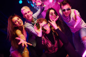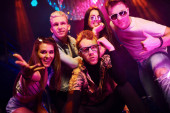Aktywna para tańczy i pozuje. Młodzi ludzie bawią się w nocnym klubie z kolorowymi światłami laserowymi.