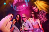 Zdjęcie "Wariują i razem pozują do kamery. Młodzi ludzie bawią się w nocnym klubie z kolorowymi światłami laserowymi." może być wykorzystywane do celów osobistych i komercyjnych zgodnie z warunkami zakupionej licencji Royalty-free. Obraz jest dostępny do pobrania w jakości wysokiej rozdzielczości do 5760x3840.