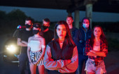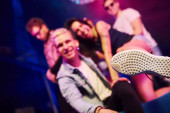 Wariują i razem pozują do kamery. Młodzi ludzie bawią się w nocnym klubie z kolorowymi światłami laserowymi.