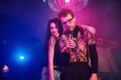 Wariują i razem pozują do kamery. Młodzi ludzie bawią się w nocnym klubie z kolorowymi światłami laserowymi.