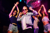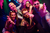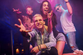 Wariują i razem pozują do kamery. Młodzi ludzie bawią się w nocnym klubie z kolorowymi światłami laserowymi.