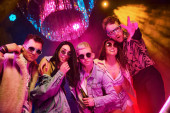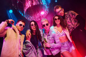 Młodzi ludzie bawią się w nocnym klubie z kolorowymi światłami laserowymi.
