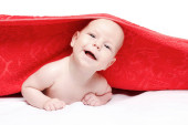 Dziewczynka po kąpieli owinięta w czerwony ręcznik układanie i pozowanie