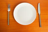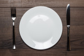 Pusty płyta z widelcem i nożem na drewnianym stole