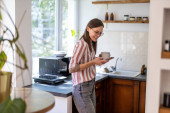 Zdjęcie "Młoda piękna brunetka w ubraniu casual siedzi w kuchni ze świeżym napojem w godzinach porannych." może być wykorzystywane do celów osobistych i komercyjnych zgodnie z warunkami zakupionej licencji Royalty-free. Obraz jest dostępny do pobrania w jakości wysokiej rozdzielczości do 5760x3840.