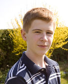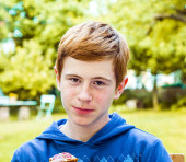 młody rudowłosy chłopiec wygląda pewnie i szczęśliwy