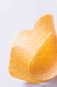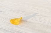 widok z góry pojedynczego chipsa ziemniaczanego z solą na białym, sztandar