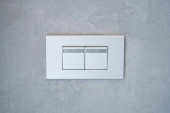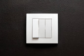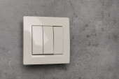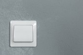 Widok na szare włączniki światła na teksturowanej ścianie w nowoczesnym mieszkaniu po remoncie. Oszczędność energii. Koncepcja bezpieczeństwa i komfortu. Minimalistyczny wystrój wnętrz domu