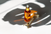 koncepcje pielęgnacji skóry - szklana butelka z olejkiem kosmetycznym lub serum, naturalne twarde światło, głębokie cienie, przestrzeń do kopiowania
