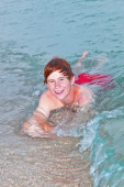 szczęśliwym chłopcem czerwony włosów jest korzystających z plaży