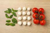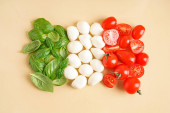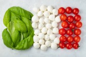 Włoska flaga zrobiona z jedzenia. Włoska sałatka caprese z wiśniowej mozzarelli, liści bazylii i pomidorów wiśniowych na białym tle.