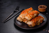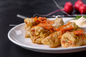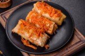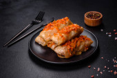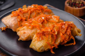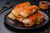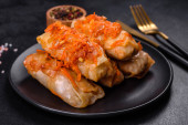 Zdjęcie "Tradycyjna nadziewana kapusta z mielonym mięsem i ryżem, podawana w sosie pomidorowym" może być wykorzystywane do celów osobistych i komercyjnych zgodnie z warunkami zakupionej licencji Royalty-free. Obraz jest dostępny do pobrania w jakości wysokiej rozdzielczości do 5760x3840.
