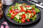 Zdjęcie "Sałatka z sałatą, ogórkiem, szpinakiem, pomidorem i przepiórczymi jajkami z ziołami i cytryną na czarnym talerzu na ciemnym betonowym tle" może być wykorzystywane do celów osobistych i komercyjnych zgodnie z warunkami zakupionej licencji Royalty-free. Obraz jest dostępny do pobrania w jakości wysokiej rozdzielczości do 5760x3840.