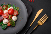 Sałatka z sałatą, ogórkiem, szpinakiem, pomidorem i przepiórczymi jajkami z ziołami i cytryną na czarnym talerzu na ciemnym betonowym tle