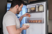 Młody wolontariusz wypełnia skrzynkę darowizn niepsującą się żywnością.