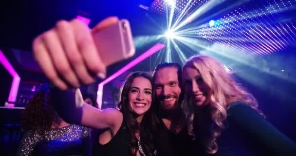 Grupa przyjaciół robi selfie telefonem komórkowym w klubie nocnym