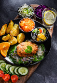 Kotlet wieprzowy panierowany pokryty okruchami chleba z ziemniakami i sałatkami warzywnymi