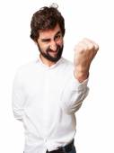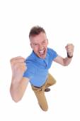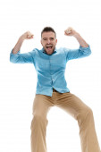 entuzjastyczny casual facet z brodą trzymając pięść w górę i świętując zwycięstwo z góry widok na białym tle w studio